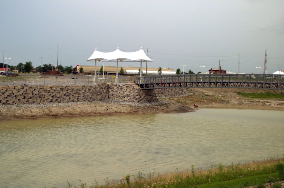 A Whitby, Ontario development was faced with such a challenge in 2009. When the Taunten Garden Power Centre development is completed, several restaurants will overlook the on-site retention pond. In total, engineers specified 4,000 square feet (372 meters) of retaining walls for the pond-so choosing a structural yet aesthetically pleasing wall system was essential. Initially, developers wanted to line the pond with natural stone; however, the walls needed to be engineered up to 12 feet (3.7 meters) high-a difficult and costly project with natural stone.