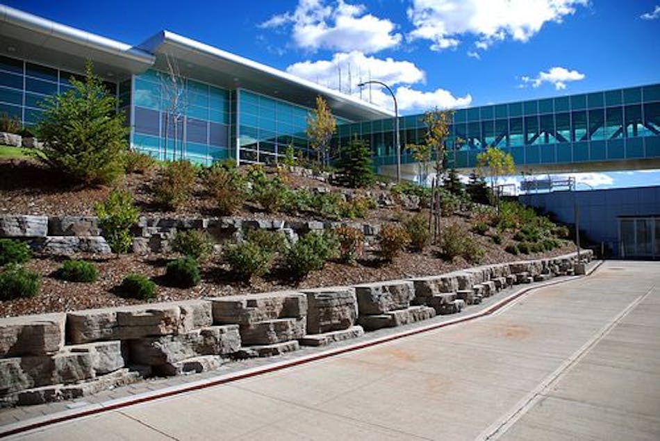 Landscape architects from Vollick McKee Petersmann and Associates Limited designed a total of 52 separate Rosetta Outcropping Collection walls in a series of angles to pick up on the architectural elements in the airport buildings. The Rosetta walls throughout the project didn't have straight sections of wall or traditionally curved sections. "We were trying to build retaining walls without them looking like retaining walls," McKee explained.