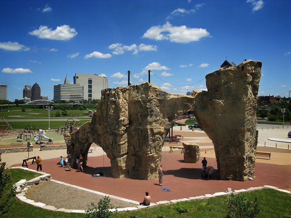 Surrounding the playground and climbing wall area, 324 square feet (30 square meters) of Rosetta Outcropping retaining walls also acted as seat walls. Outcropping is a larger scale wall system that features 12 unique unit sizes and 24 unique stone textures. Dimensions of Outcropping blocks vary from 24 to 72-inches (610 to 1,829-millimeters) wide and from 6 to 24-inches (152 to 610-millimeters) tall.