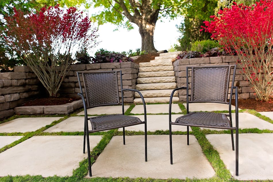 You don't need to sacrifice plant life remaining a part of your patio when you use Miros Slabs. Other products shown: Kodah Walls and Dimensional Steps
