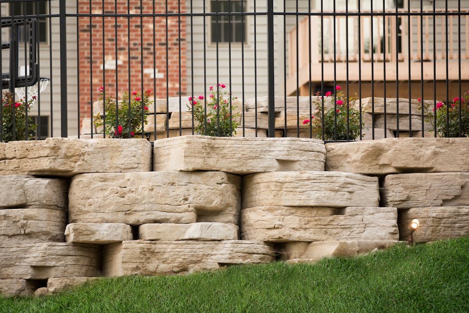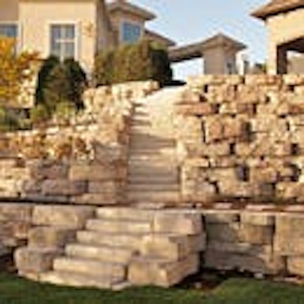 "My house is covered in natural stone from a quarry. The retaining walls are man-made blocks, but they look like they were custom made to match my house. It's a seamless transition."