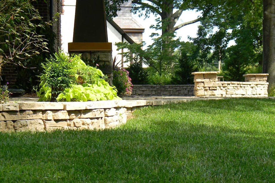 The 700-square-foot (65-square-meter) patio was outlined with freestanding Belvedere walls and columns topped with Rosetta caps. Belvedere walls were a perfect choice to enclose the patio because they can double as seat walls.